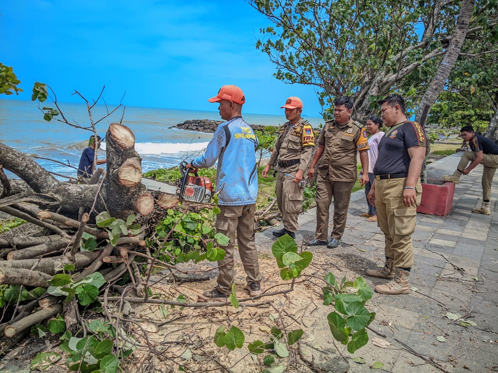 Petugas bersama warga mengevakuasi pohon tumbang yang melintang di kawasan pesisir akibat cuaca ekstrem.